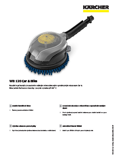Díky uvolňovací páce lze inovativní vyměnitelné příslušenství Car & Bike rychle a snadno vyměnit, aniž by se dostalo do kontaktu s nečistotami, a jeho průhledné pouzdro nabízí vynikající zážitek z čištění. Díky chytrému suchému zipu lze po čištění vyčistit hadříkovou část dvoudílného nástavce a prát v pračce při 60 ° C. Kartáč na tlakovou myčku s měkkým hadříkem z mikrovlákna je ideální pro šetrné čištění automobilů a motocyklů. Prací prostředek lze v případě potřeby nanášet pomocí tlakové myčky. Díky nové převodovce se WB 120 může pochlubit větším výkonem než předchozí modely - pro efektivní a důkladné čištění. Rotační mycí kartáč lze připevnit ke všem tlakovým myčkám Kärcher ve třídách K 2 až K 7. Výměnné nástavce Universal a Home & Garden, které jsou k dispozici samostatně, jsou vhodné pro všechny hladké povrchy nebo speciálně přizpůsobené odolným povrchům a jsou kompatibilní s jak WB 120, tak jeho předchůdce, WB 100.