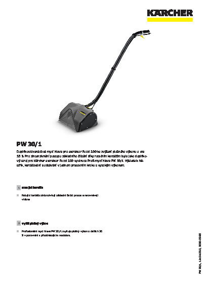 Pro zintenzivnění postupu základního čištění díky rotačním kartáčům (1.800 l/min) byla jako doplňkový stroj pro Kärcher extraktor Puzzi 200 a Puzzi 10/2 vyvinuta Profi-mycí hlava PW 30/1. Výsledek: Nástřik, kartáčování a odsávání v jednom pracovním kroku s vysokým výkonem. S větší pracovní šířkou 315 mm, oproti 235 mm u PW 10 a tím i o 25 % vyšším plošným výkonem, tvoří PW 30/1 ve spojení s Puzzi 200 výrazně efektivnější čisticí systém s vynikající čisticí silou.