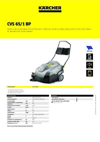 Bateriový, nízkohlučný CVS 65/1 Bp na koberce pro čištění středních až velkých kobercových ploch. Zametací stroj má dvoustupňový filtrační systém.
