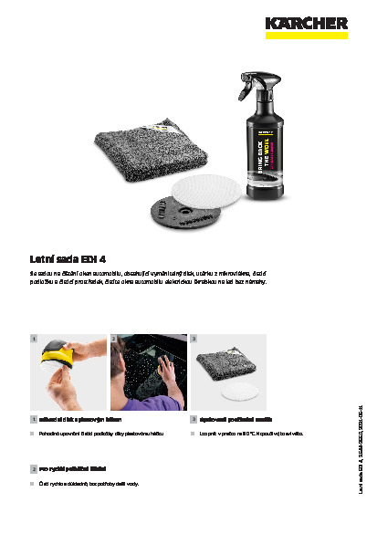 Perfektní doplněk: Sada na čištění oken automobilů umožňuje používat elektrickou škrabku na led od společnosti Kärcher po celý rok. Sada se skládá ze 4 komponentů, které zaručují hloubkové čištění oken automobilu: vyměnitelný disk s plastovým hákem, čisticí podložka jako nástavec, čistič skel automobilu RM 650 a hadřík z mikrovlákna. Díky jednoduché výměně kotouče na odběr materiálu EDI 4 za náhradní kotouč s nástavcem lze použít silné otáčení elektrické škrabky na led k uvolňování nečistot, jako jsou zbytky hmyzu nebo trus ptáků. Čistič autoskel RM 650 napomáhá k uvolňování nečistot a poskytuje potřebnou fólii bez dalšího použití vody. Měkký hadřík z mikrovlákna zaručuje výsledek bez šmouh. Sada na čištění oken automobilu je dokonalým doplňkem pro rychlé mezičištění. Lze prát čisticí podložku i hadřík z mikrovláken, což umožňuje opakované použití.