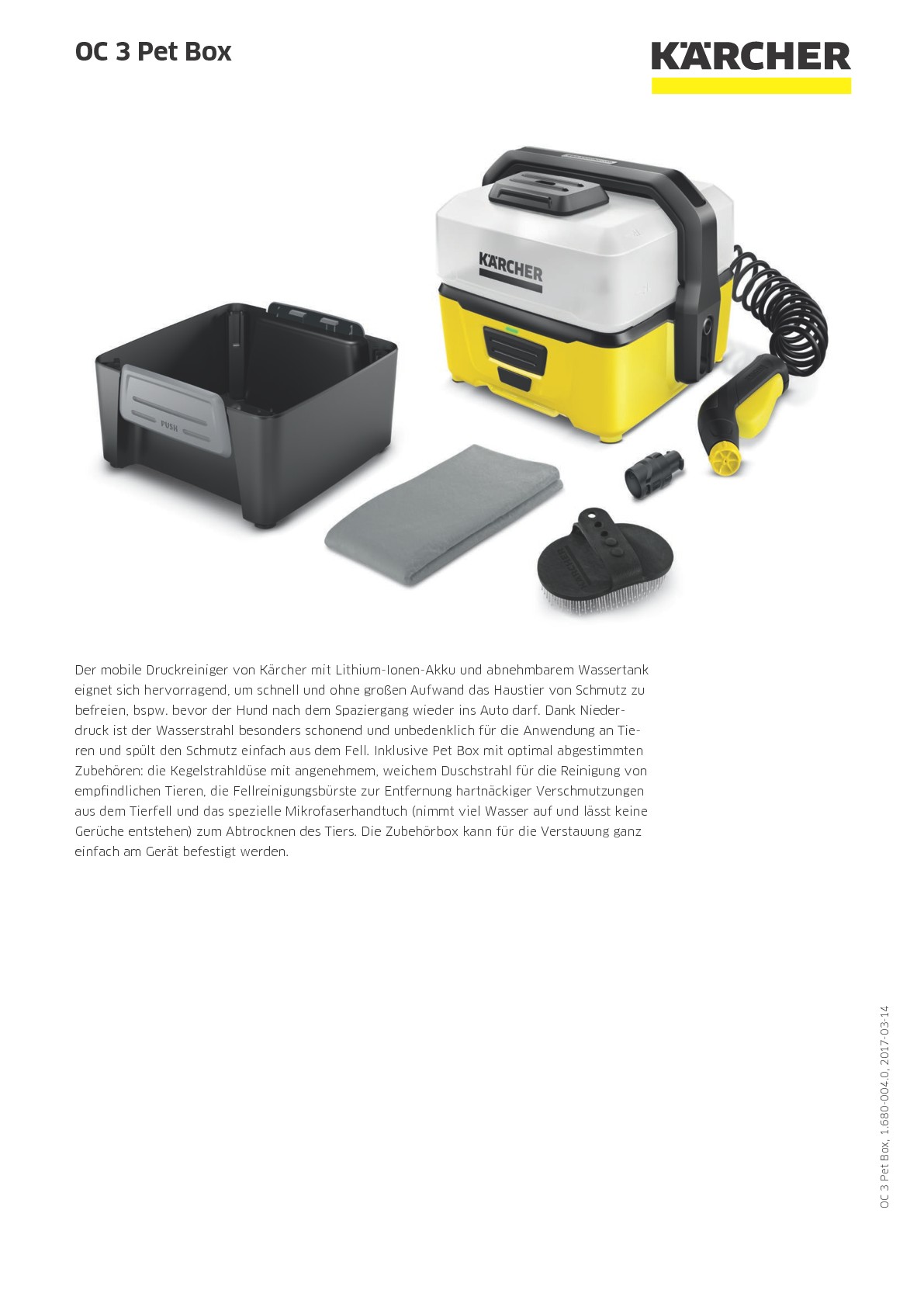 Mobilní outdoorový čistič firmy Kärcher s lithium-iontovou baterií a odnímatelnou nádrží na vodu je dokonalý pro rychlé očištění domácích zvířat od nečistot bez velké námahy, např. než pes opět skočí do auta. Díky nízkotlaku je vodní paprsek mimořádně šetrný a neškodný pro používání na zvířata a snadno opláchne nečistoty ze srsti. Včetně pet boxu s optimálně zvoleným příslušenstvím: vířivá tryska s měkkým sprchovacím paprskem pro citlivá zvířata, kartáč na čištění srsti pro odstraňování silně ulpívajících nečistot a speciální utěrka z mikrovláken (savá a pohlcuje pachy) pro osušení zvířete. Box na příslušenství lze snadno upevnit na zařízení.