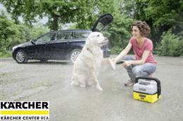 Pro šetrné čištění domácích zvířat: mobilní outdoorový čistič Kärcher s lithium-ionovou baterií a nádrží na vodu. Mimořádně šetrný díky nízkotlakému paprsku a speciálnímu příslušenství.