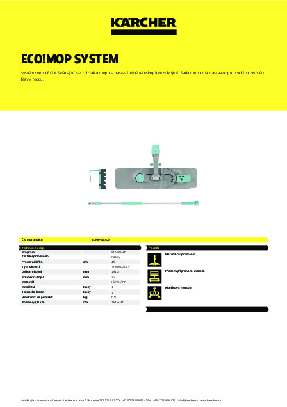 Systém ECO! Mop od společnosti Kärcher má možnost aretace na univerzálním kloubu a 184 centimetrů výsuvnou teleskopickou rukojeť, což z něj činí perfektní volbu i pro vertikální úklidové práce. Díky kapesnímu uchycení umožňuje sada mopů rychlou a snadnou výměnu hlavy mopu. Díky klipu k zajištění je tento systém také přívětivý k zádům, aniž byste se museli neustále ohýbat.