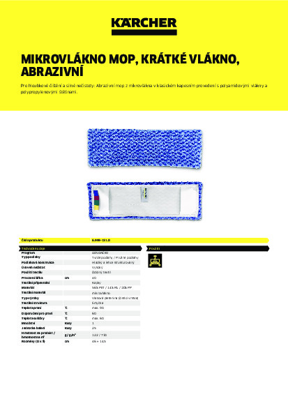 Utěrka "Mikrovlákno, krátké vlákno" v klasickém kapesním provedení pro univerzální použití. Jemná mikrovlákna a brusné pásy vyrobené z polyamidových vláken a robustních polypropylenových štětin také účinně odstraňují odolné nečistoty a mají dobře vyvážené kluzné vlastnosti bez námahy. Utěrka má navíc obšité rohy a celkem 4 poutka v barvách modrá, červená, žlutá a zelená. Pomocí tohoto barevně odlišeného systému lze látku jasně přiřadit k určité části, která má být čištěna, a účinně zabránit křížové kontaminaci – nepotřebné smyčky se jednoduše odstřihnou. Mop z mikrovlákna je vhodný jak pro použití v systému plochého mopu s dvoukbelíkovým vozíkem nebo jednokbelíkovým vozíkem a lisem, tak i pro předpřipravené aplikace.