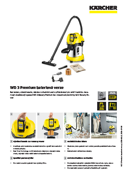 Vysavač WD 3 Battery Premium Set již obsahuje baterii s dobou chodu 15 minut, abyste hned mohli začít. Přitom se stav baterie vždy zobrazí na jejím LCD displeji. Bateriový a výkonný víceúčelový vysavač obsahuje ve variantě Premium robustní a nárazu odolnou nádobu z ušlechtilé oceli. Nezávisle na elektrické síti nabízí kompletní funkčnost víceúčelového vysavače. Sací hadice s optimalizovaným prouděním a chytrá podlahová hubice s vložkou zlepšují vysávání nečistot a umožňují čistotu beze zbytku. Díky patronovému filtru lze pohodlně vysávat suché i mokré nečistoty zcela bez výměny filtru. Další výhody: funkce fukaru, parkovací poloha pro sací trubku a podlahovou hubici, uzavírací systém „Pull ’n’ Push“, ergonomická rukojeť a mimořádně praktická úschova příslušenství. Vysavač WD 3 Battery Premium Set je součástí bateriové platformy 36 V Battery Power, díky čemuž lze jeho baterii používat i v jiných zařízeních s bateriovou platformou 36 V - pro ještě více flexibility.