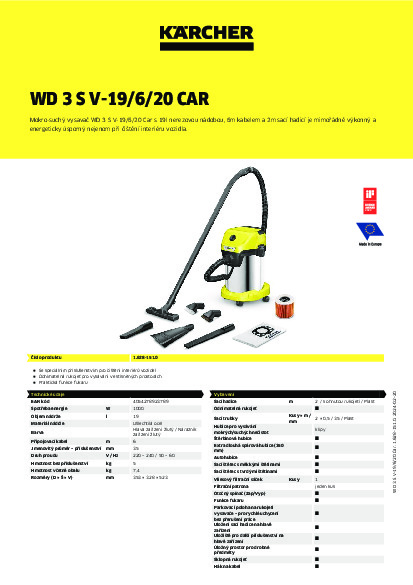 Vysavač na mokré a suché vysávání WD 3 S V-19/6/20 Car je mimořádně výkonný, energeticky úsporný a kompaktní - se spotřebou pouhých 1000 W. Přístroj zaujme hubicí do auta, extra dlouhou štěrbinovou hubicí a sacím kartáčem s měkkými a tvrdými štětinami. Ať už se jedná o citlivé povrchy, jako je palubní deska, silně znečištěná místa, jako je prostor pro nohy, velké plochy, jako je zavazadlový prostor, nebo úzké prostory mezi sedadly: Díky speciálním kartáčům a tryskám lze bez problémů důkladně vyčistit každý prostor uvnitř vozidla. Odnímatelná rukojeť umožňuje připojení kartáčů a trysek přímo k sací hadici, a tím i bezproblémovou práci ve stísněných prostorech. Je vybaven robustní a nárazuvzdornou nádobou z nerezové oceli o objemu 19 l, 6 m kabelem a 2 m sací hadicí s odnímatelnou rukojetí, podlahovou hubicí Clips, štěrbinovou hubicí, patronovým filtrem a filtračním sáčkem. Jednodílný filtr umožňuje vysávání suchých i mokrých nečistot bez nutnosti výměny filtru. Další vlastnosti: možnost skladování v hlavě stroje, praktická funkce foukání, uzamykací systém "Pull & Push" pro jednoduché otevírání a zavírání nádoby a ergonomicky tvarovaná rukojeť pro přenášení.