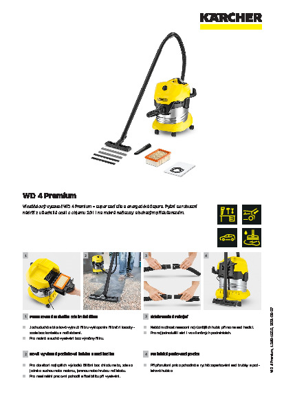 Průmyslový vysavač WD 4 Premium je přístroj střední třídy, který nabízí robustní, nárazuvzdornou nádrž z nekorodující ušlechtilé oceli o objemu 20 l a je vybaven patronovým filtrem ve filtrové kazetě, který lze snadno vyklopením vyjmout, aniž byste přišli do kontaktu s nečistotami. Filtr je ideální pro multifunkční vysávání (na suché i mokré vysávání) bez potřeby výměny filtru. Vysavač disponuje super sací silou při spotřebě proudu jen 1000 Watt. Další funkce přístroje jsou „Pull & Push“ uzavírací systém, ergonomicky tvarovaná rukojeť, praktická úschova kabelů a příslušenství na vysavači. Odnímatelná rukojeť umožňuje montáž příslušenství přímo na sací hadici. V kombinaci s nově koncipovanou sací hadicí zajišťuje nová podlahová hubice na klipsy se svými 2 gumovými a 2 kartáčovými pásky naprosto dokonalé zachycení nečistot všeho druhu. Při přerušení práce lze sací trubici a podlahovou hubici rychle a snadno zaparkovat. Tento vysavač na suché a mokré vysávání je vhodný například pro úklid auta, malého množství vody, vstupních prostor nebo sklepů.