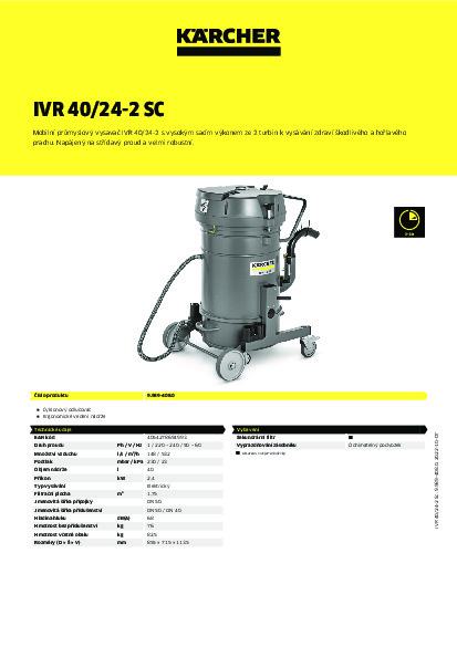 IVR 40/24-2 je mobilní průmyslový vysavač vhodný k bezpečnému vysávání malého množství hořlavého a zdraví škodlivého prachu (mezní hodnota na pracovišti > 0,1 mg/m³) a jemných třísek s filtrační technikou třídy prachu M. Výkonem 2,4 kW garantuje výkonné dvouturbínové řešení s napájením na střídavý proud vysoký sací výkon. I robustní konstrukce odpovídá speciálním požadavkům průmyslu. Prací kapsový filtr s dlouhou životností a manuálním mechanismem oklepávání k čištění filtru se starají o konstantně vysoký sací výkon. K vyprazdňování sběrné nádoby s kolečky o objemu 40 litrů se využívá sklápěcí podvozek bez snímání hlavy pohonu. O téměř bezprašné vyprazdňování a bezpečnou likvidaci vysátých nečistot se stará PE pytel s integrovaným mechanismem zavírání a hadice na vyrovnání tlaku. Nízká hlučnost při provozu a kompaktní konstrukce pro snadný servis doplňují vybavení vysavače.