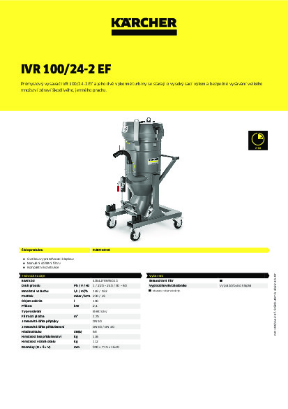 Bezpečná filtrační technika třídy prachu M i 2 výkonné turbíny s výkonem 2,4 kW průmyslového vysavače IVR 100/24-2 Ef umožňují vysávání jemného a zdraví škodlivého (mezní hodnota na pracovišti ≥ 0,1 mg/m³) prachu a třísek ve velkém množství. Mobilní zařízení s pohonem na střídavý proud vybavené pracím filtrem s dlouhou životností a manuálním čištěním filtru pro konstantně vysoký sací výkon, které je díky robustní konstrukci se snadným servisem zvlášť konstruované pro požadavky průmyslu. Sběrnou nádobu na nečistoty o objemu 100 litrů lze vyprazdňovat volitelně pomocí ergonomického podvozku, vysokozdvižného vozíku nebo jeřábu – vždy bez odejmutí hlavy pohonu. V případě potřeby je možné i vyprazdňování na speciální místo zákazníka, jako do podúrovňového dopravníku nebo kontejneru.