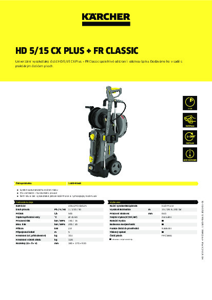 Vysokotlaký mycí stroj KÄRCHER HD 5/15 CX Plus je vysoce kvalitní s napájecím napětím 230 V 50 Hz. Základem stroje je kvalitní, 3 pístové axiální čerpadlo z velmi kvalitních materiálů s dlouhou životností, vybavené vysokotlakým a doplňkově rovněž nízkotlakým těsněním a hlava válce z mosazi, včetně integrovaného mosazného přívodu vody. Stroj je opatřen stabilním zafixovaným držákem z hliníku a praktickým uložením příslušenství na stroji pro elektrický kabel, VT hadici a rotační trysku. Stabilitu zajišťují stroji mohutná zadní kola, která rovněž umožňují snadnou manipulaci se strojem. Samozřejmostí je automatické vypínání tlaku při uvolnění pistole. Stroj disponuje plynulou regulací pracovního tlaku a regulovatelným přisáváním chemického prostředku.