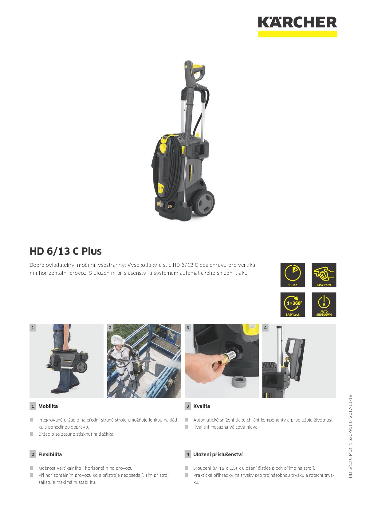 Kompaktní, lehký a všestranný vysokotlaký čistič Kärcher HD 6/13 C bez ohřevu přesvědčí vynikající mobilitou a navíc je vhodný pro provoz ve vertikální i horizontální poloze. Stroj je vybavený chytrým ukládáním příslušenství a díky mosazné hlavě válců a systému automatického snížení tlaku slibuje dlouhou životnost. Zároveň si vás získá i novinkami, které trvale zvyšují pracovní komfort pro uživatele tím, že umožňují práci bez únavy a krátkou dobu přípravy stroje. Vysokotlaká pistole EASY!Force využívá zpětný ráz vysokotlakého paprsku ke snížení síly potřebné pro stisk rukojeti na nulu, zatímco rychlospojky EASY!Lock dovolují v porovnání s běžným šroubením až 5 krát rychlejší manipulaci, aniž by došlo k ústupkům v robustnosti a životnosti. Celkově klíčový balíček vybavení pro vynikající výsledky čištění při vysokém komfortu a dlouhé životnosti.