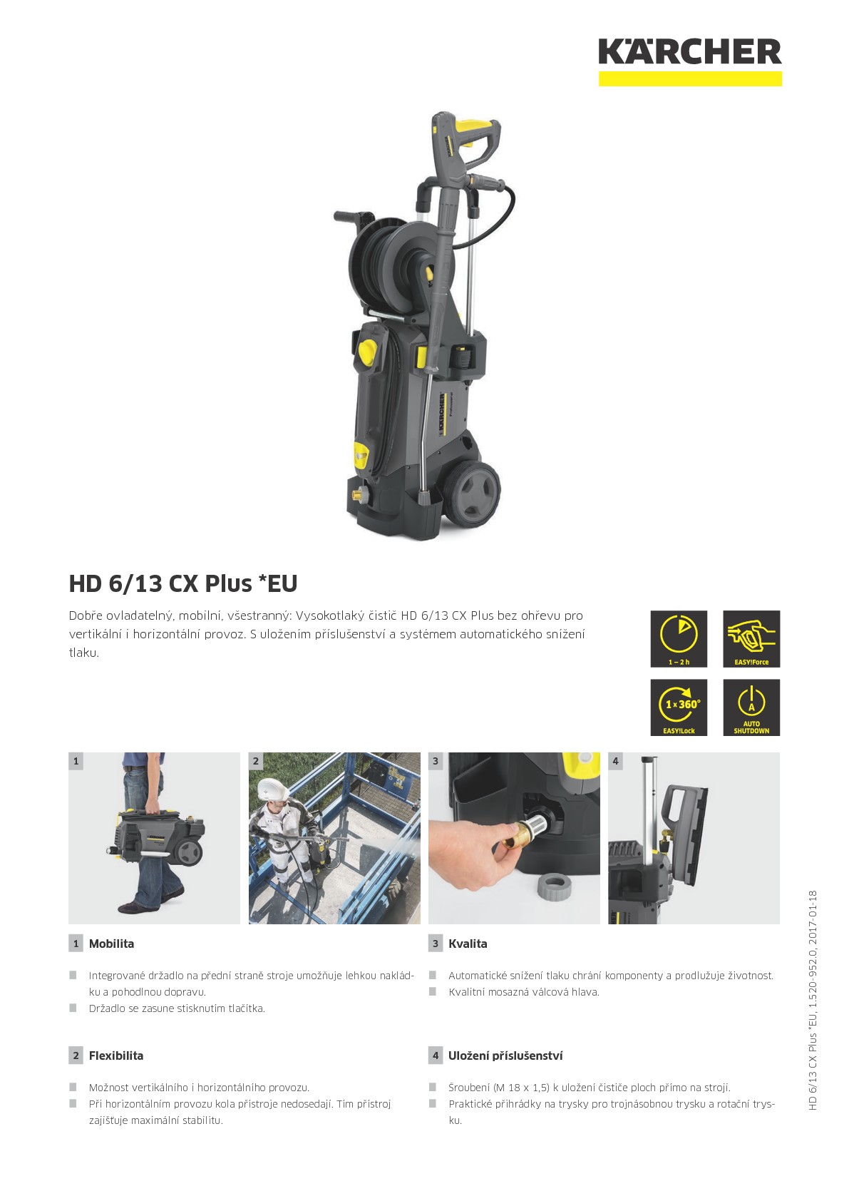 Kompaktní, lehký a všestranný vysokotlaký čistič Kärcher HD 6/13 CX Plus bez ohřevu přesvědčí vynikající mobilitou a navíc je vhodný pro provoz ve vertikální i horizontální poloze. Stroj je vybavený chytrým ukládáním příslušenství a díky mosazné hlavě válců a systému automatického snížení tlaku slibuje dlouhou životnost. Zároveň si vás získá i novinkami, které trvale zvyšují pracovní komfort pro uživatele tím, že umožňují práci bez únavy a krátkou dobu přípravy stroje. Vysokotlaká pistole EASY!Force využívá zpětný ráz vysokotlakého paprsku ke snížení síly potřebné pro stisk rukojeti na nulu, zatímco rychlospojky EASY!Lock dovolují v porovnání s běžným šroubením až 5 krát rychlejší manipulaci, aniž by došlo k ústupkům v robustnosti a životnosti. Celkově klíčový balíček vybavení pro vynikající výsledky čištění při vysokém komfortu a dlouhé životnosti.