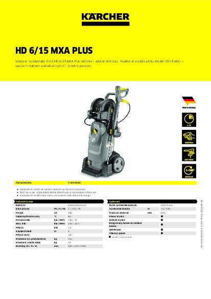 Mobilní vysokotlaký čistič na střídavý proud HD 6/15 MXA Plus s řízením tlakovým spínačem, integrovaným automatickým navíjecím bubnem hadice pro pohodlnou manipulaci s vysokotlakou hadicí i četnými možnostmi odložení a úschovy příslušenství. Nově vyvinuté, robustní třípístové axiální čerpadlo s mosaznou hlavou garantuje dlouhou životnost dobře manévrovatelného a snadno uskladnitelného stroje, snižuje spotřebu energie a zároveň zlepšuje výkon čištění až o 20 procent. Práci bez únavy a úsporu času umožňují vysokotlaká pistole EASY!Force, která využívá reaktivní sílu vysokotlakého paprsku, snižuje sílu potřebnou pro držení na nulu a rychlouzávěry EASY!Lock se v porovnání s běžnými šroubovacími spoji postarají až o pětkrát rychlejší manipulaci, aniž by přitom utrpěla robustnost a dlouhá životnost. Systém automatického snížení tlaku chrání efektivně a spolehlivě vysokotlaké komponenty před zátěží v provozu stand-by. Vysokotlaké čerpadlo a elektronické komponenty jsou díky uživatelsky přívětivé konstrukci stroje mimořádně dobře přístupné pro servis.