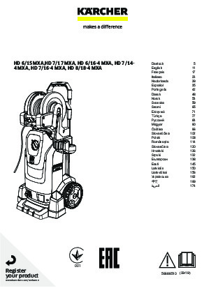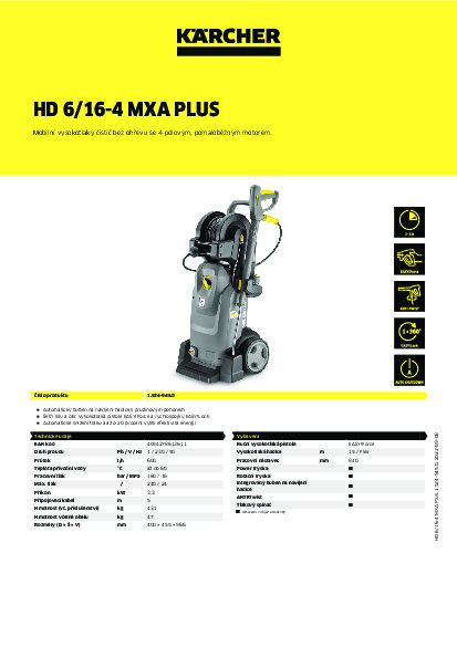 HD 6/16-4 MXA: výkonný, mobilní vysokotlaký čistič se 4-pólovým, pomaloběžným motorem na střídavý proud, řízením tlakovým spínačem, otočným pracovním nástavcem a otočně uloženou vysokotlakou hadicí. Výsuvné hliníkové držadlo zajišťuje jednoduchou manévrovatelnost a slouží kromě jiného k uložení příslušenství. Dávkovací systém čisticího prostředku SwitchChem umožňuje pomocí systému rychlé výměny flexibilní a dlouhou dobu používání i nasazení dvou různých čisticích prostředků. O práci bez únavy a časově úspornou přípravu stroje se starají vysokotlaká pistole EASY!Force a rychlouzávěry EASY!: Zatímco vysokotlaká pistole EASY!Force využívá reaktivní sílu vysokotlakého paprsku ke snížení síly nutné k držení spouště na nulu, dovolují rychlospojky EASY!Lock v porovnání s běžnými šroubovacími spoji až pětkrát rychlejší manipulaci, aniž by přitom utrpěla robustnost a dlouhá životnost. Dlouhou životnost garantuje robustní třípístové axiální čerpadlo s mosaznou hlavou.