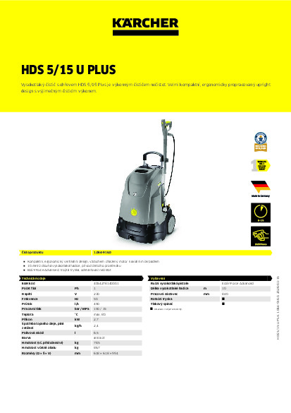 HDS 5/15 U Plus: základní model ve třídě vysokotlakých čističů s ohřevem zaujme propracovanou a inovativní upright konstrukcí. Tento typ horizontální konstrukce stroje přináší sníženou hmotnost a velmi kompaktní rozměry. Díky tomu se stroj velmi snadno přepravuje v kombi vozech, díky velkým kolům a tlačnému madlu - je velmi mobilní na nerovném povrchu. Vysoce účinný čisticí výkon je zaručen kombinací patentované technologie trysek, turbo dmychadla, zvýšené účinnosti čerpadla a výkonné rotační trysky. Díky vysokotlaké pistoli EASY!Force, která využívá sílu zpětného rázu vysokotlaké trysky a snižuje tak přídržnou sílu pro obsluhu na nulu, a systému EASY!Lock, díky němuž je sestavení a demontáž pětkrát rychlejší než u běžných šroubových spojů, je použití stroje velmi pohodlné. Rozsáhlou výbavu stroje doplňuje snadná obsluha, možnosti uložení hadice a pracovního nástavce a vestavěný hadicový naviják s 15metrovou tlakovou hadicí.