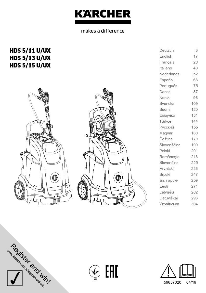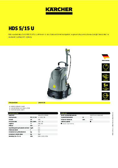 HDS 5/15 U: Základní model třídy vysokotlakých čističů s ohřevem si vás získá promyšlenou a inovativní Upright konstrukcí. Tento způsob koncepce stroje vede k nízké hmotnosti a velmi kompaktním rozměrům. Tak lze stroj snadno přepravovat v osobním voze kombi, ale je i díky velkým kolům a vysouvacímu držadlu velmi mobilní na nerovném terénu. Souhra patentované technologie trysek, turbodmychadla a vyšší účinnosti čerpadla garantují vysoce efektivní výkon čištění. Komfortní práci umožňují vysokotlaká pistole EASY!Force, která využívá zpětný ráz vysokotlakého paprsku ke snížení síly potřebné pro stisk rukojeti na nulu, a rychlospojek EASY!Lock, se kterými je příprava stroje v porovnání s běžným šroubením až 5 krát rychlejší. Snadná obsluha a možnosti uložení hadice a pracovního nástavce doplňují bohatou výbavu stroje.požadovaných hodnot emisí jsou právě tak znaky osvědčené KÄRCHER technologie hořáku, která je především uplatňována v této třídě. Vysoce efektivní výkon čištění díky patentované technologii trysek, turbodmychadlu a vyššímu stupni účinnosti čerpadla. Optimalizované příslušenství je přesně sladěno s potřebami zákazníků. Centrální spínač a možnosti odkládání pro hadici a pracovní nástavec s tryskou zvyšují komfort obsluhy. Třípístové axiální čerpadlo. Nová optimalizovaná platforma čerpadla se vyznačuje zvláště vysokým stupněm účinnosti a dlouhou životností. Stroj na střídavý proud se vzduchem chlazeným, 2-pólovým elektromotorem. Přimíchávání čisticích prostředků v nízkotlakém provozu.