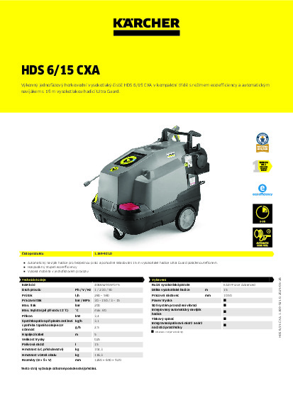 Ergonomický a uživatelsky přívětivý: jednofázový HDS 6/15 CXA s režimem eco!efficiency je výkonný horkovodní vysokotlaký čistič v kompaktní třídě. Robustní 3-pístové axiální čerpadlo vytváří potřebný tlak. Automatický naviják pro navíjení a odvíjení 15 metrů dlouhé vysokotlaké hadice Ultra Guard potaženou teflonem i pod tlakem zajišťuje vysoký komfort a krátké časy pro zprovoznění stroje. Vysokotlaká pistole EASY!Force Advanced s patentovanou technologií trysek a rychlospojkami EASY!Lock umožňují ergonomickou práci. SDS systém snižuje vibrace. Technologie horké vody účinně čistí i mastnotu a snižuje spotřebu detergentů, které jsou přesně dávkovány z 15,5litrové nádrže. Tlak a průtok vody lze upravit v závislosti na činnosti. HDS 6/15 CXA nenáročný na údržbu je určen pro každodenní použití v náročných podmínkách. Vodní filtr a bezpečnostní ventil chrání technologii. Robustní podvozek chrání před nárazy, zatímco velká kola a řídicí kolečko nabízejí vysokou manévrovatelnost. K dispozici jsou integrované úložné prostory pro příslušenství.