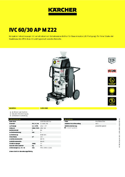 Kompaktní průmyslový vysavač IVC 60/30 Ap M Z22 je jako stvořený pro čištění ve výrobních prostorách a výrobních strojů. Díky svému neopotřebitelnému kompresoru bočního kanálu je přístroj vhodný pro kontinuální použití a tím je ideální jako stacionární sací zařízení u výrobních a balicích strojů. Manuální čištění filtru mnohokrát prodlužuje životnost filtru. Průmyslové vysavače kompaktní třídy s certifikací ATEX jsou schválené pro použití v zóně 22 oblastí s nebezpečím výbuchu. Díky inovativní technologii motoru jsou tyto stroje ideální pro trvalé používání.