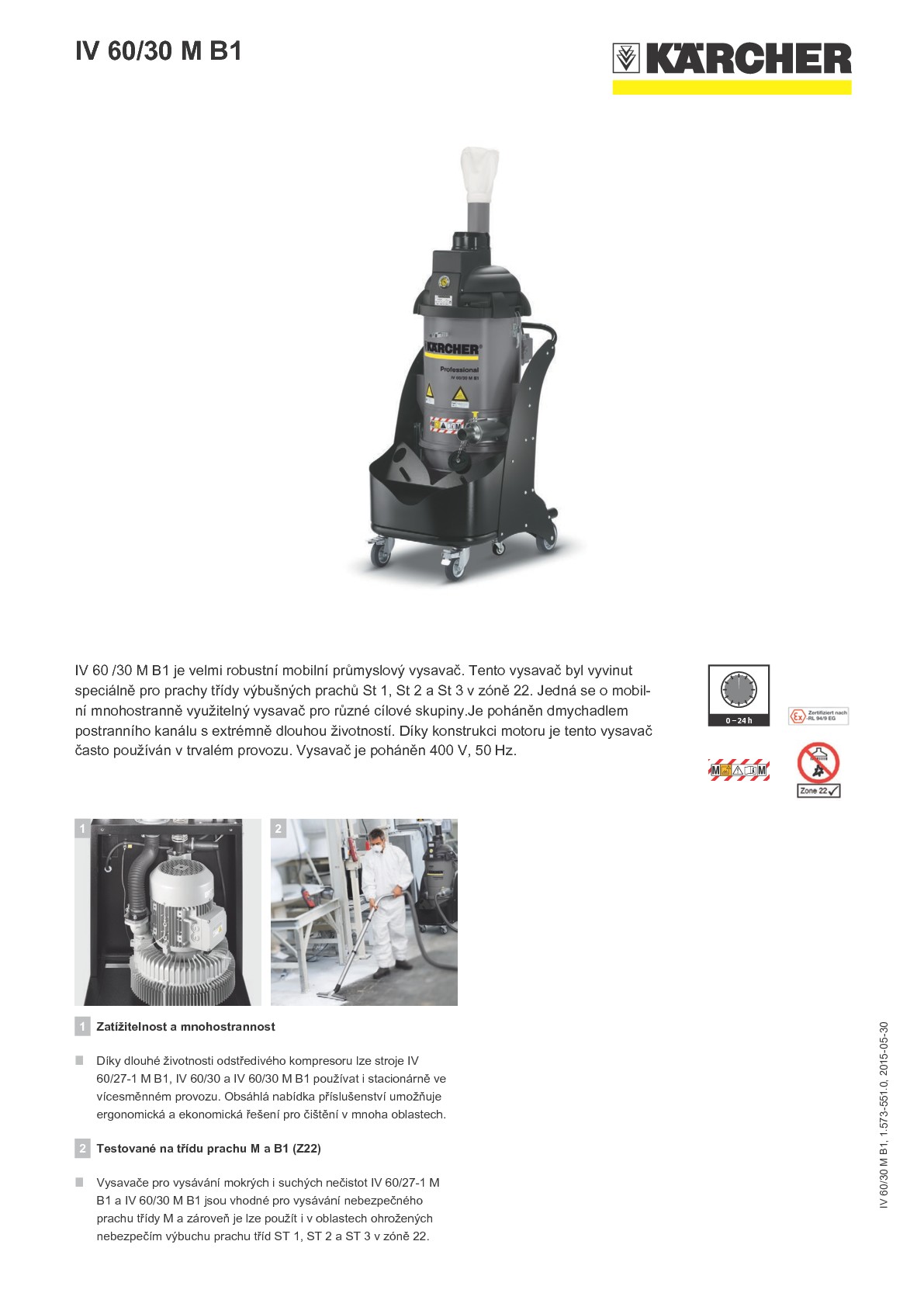 IV 60 /30 M B1 je velmi robustní mobilní průmyslový vysavač. Tento vysavač byl vyvinut speciálně pro prachy třídy výbušných prachů St 1, St 2 a St 3 v zóně 22. Jedná se o mobilní mnohostranně využitelný vysavač pro různé cílové skupiny. Je poháněn dmychadlem postranního kanálu s extrémně dlouhou životností. Díky své konstrukci a množství průmyslového příslušenství ho lze použít pro mnoho úkolů z oblasti čištění. Veškeré průmyslové příslušenství Kärcher, které je k dispozici, je elektricky vodivé a pro stroje B1 povoleno. Jeho dmychadlo postranního kanálu se stará o vysoký sací výkon. Díky kostrukci motoru se tento stroj používá často v trvalém provozu. Použité dmychadlo postranního kanálu vykazuje velmi dlouhou životnost. Podmíněně své konstrukci a velikosti, lze tento stroj používat i mobilně, tzn. použít na více místech v podniku. Pokud musí být vysavač při práci odstaven na nějaké stoupání, postarají se dvě kolečka opatřená brzdou o bezpečné stání. Vyjímatelná nádoba na nečistoty s kolečky umožňuje jednoduchý odvoz vysátých nečistot. Zabudovaný cyklonový odlučovač odloučí největší množství prachu již při vstupu do vysavače a tím prodlužuje výrazně životnost filtrů. Filtr s velkou filtrační plochou a vysokým výkonem zachycení (prověřeno pro M) se postará o dlouhé pracovní intervaly bez přerušení. Držák příslušenství na přední straně stroje umožňuje velmi komfortní uložení kompletního sacího příslušenství. V dodatečně zabudované přihrádce lze uložit malé díly příslušenství nebo nářadí. Na zabudovaný hák na kabel lze zavěsit elektrokabel při přepravě nebo zbytek kabelu při práci. Manuální, externí očištění filtru zajistí dlouhé pracovní intervaly a dlouhou životnost filtru. Pokud musí být vysavač pri práci odstaven na nakloněnou plochu, zajistí dvě vodicí kolečka vybavená brzdou bezpečné stání.
