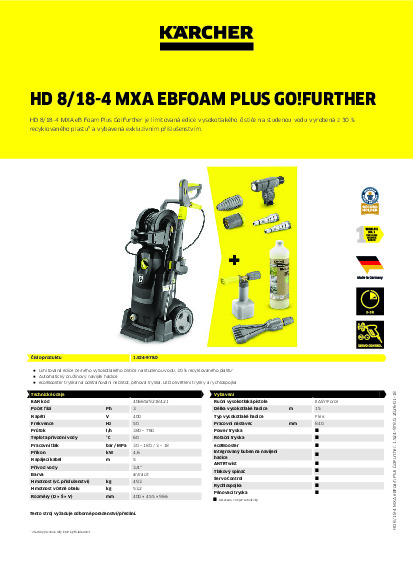HD 8/18-4 MXA eB Foam Plus Go!Further je limitovaná edice vysokotlakého čističe na studenou vodu vyrobená z 30 % recyklovaného plastu¹⁾ a vybavená exkluzivním příslušenstvím.