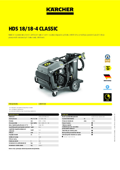 Mobilní vysokotlaký čistič s ohřevem HDS 18/18-4 S Classic se díky svému enormnímu průtoku 1800 litrů za hodinu pyšní maximální účinností při odstraňování nejodolnějších nečistot. Robustní čerpadlo klikového hřídele, které je chráněno jemným vodním filtrem, umožňuje také pracovní tlak až 180 barů a paralelní použití dvou pracovních nástavců. Spouštěcí pistole EASY!Force Advanced se Servo Control pro úpravu objemu vody a tlaku přímo ze spouštěcí pistole zajišťuje práci bez únavy. Kola odolná proti proražení, dvě kolečka a jeřábový hák také přispívají k uživatelsky příjemné manipulaci a umožňují snadnou přepravu stroje. HDS 18/18-4 S Classic má také vzduchem chlazený, čtyřpólový, pomaluběžný elektromotor s pozvolným rozběhem, hlídáním plamene při stacionárním provozu, dávkováním systémové péče v plovákové skříni pro ochranu před vápennými usazeninami a Režim eco!efficiency pro hospodárný provoz. Navíc robustní rám z ocelových trubek spolehlivě chrání stroj před poškozením. Součástí dodávky je desetimetrová vysokotlaká hadice.