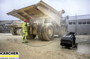 Mobilní vysokotlaký čistič s ohřevem nabízí velmi vysokou kapacitu průtoku 1800 l/h a umožňuje paralelní použití dvou pracovních nástavců při tlaku vody 180 barů.