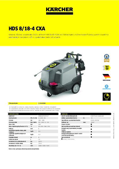 Nejvýkonnější 3fázový vysokotlaký čistič s ohřevem ve třídě kompak, včetně automatického navíjáku VT hadice: HDS 8/18-4 CXA s eco!efficiency a parním režimem. Jeho výkonný 4-pólový motor je chlazený vodou. Robustní axiální čerpadlo se třemi keramickými písty vytváří vysoký tlak. Automatický naviják pro navíjení a odvíjení 15metrové vysokotlaké hadice Ultra Guard potažené teflonem i pod tlakem zajišťuje flexibilitu a krátké časy nastavení. Vysokotlaká pistole EASY!Force Advanced se Servo Control pro nastavení tlaku a průtoku vody, patentovaná technologie trysek a rychlospojky EASY!Lock umožňují ergonomickou práci. SDS systém snižuje vibrace. Technologie horké vody účinně čistí i maziva a snižuje spotřebu detergentů, které jsou přesně dávkovány z 15,5litrové nádrže. HDS 8/18-4 CXA nenáročný na údržbu je určen pro každodenní použití v náročných podmínkách. Vodní filtr a bezpečnostní ventil chrání technologii. Robustní podvozek chrání před nárazy, zatímco velká kola a řídicí kolečko nabízejí vysokou manévrovatelnost.