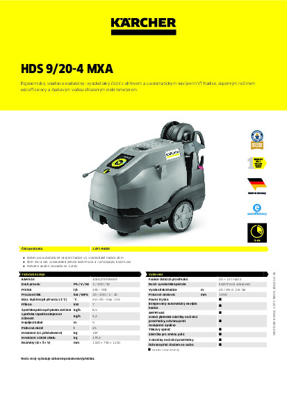 Díky automatickému navijáku hadice s integrovanou 20metrovou hadicí Ultra Guard HP s teflonovým povrchem přesvědčí vysokotlaký čistič HDS 9/20-4 MXA maximálním uživatelským komfortem a krátkou dobou nastavení. Hadicový naviják umožňuje navíjení a odvíjení hadice pod úhlem až 45° a také zkracuje obvyklou dobu seřizování o více než 50 %. Vysoce kvalitní komponenty a systémy, jako je vodou chlazený 4pólový elektromotor, robustní 3pístové axiální čerpadlo s keramickým pístem, optimalizovaná technika hořáku a úsporný režim eco!efficiency, spolehlivě zajišťují hospodárný a bezpečný provoz. Inovativní spouštěcí pistole EASY!Force Advanced se servocontrol a 1050 milimetrovým pracovním nástavcem navíc umožňuje čištění bez únavy. Stroj střední třídy, který je šetrný k údržbě, navíc vyniká 2 nádržemi na čisticí prostředky, rozsáhlou bezpečnostní technikou, patentovanou technologií trysek, vysokou mobilitou, intuitivním ovládáním, časově úsporným systémem EASY!Lock a důmyslnými možnostmi skladování příslušenství.