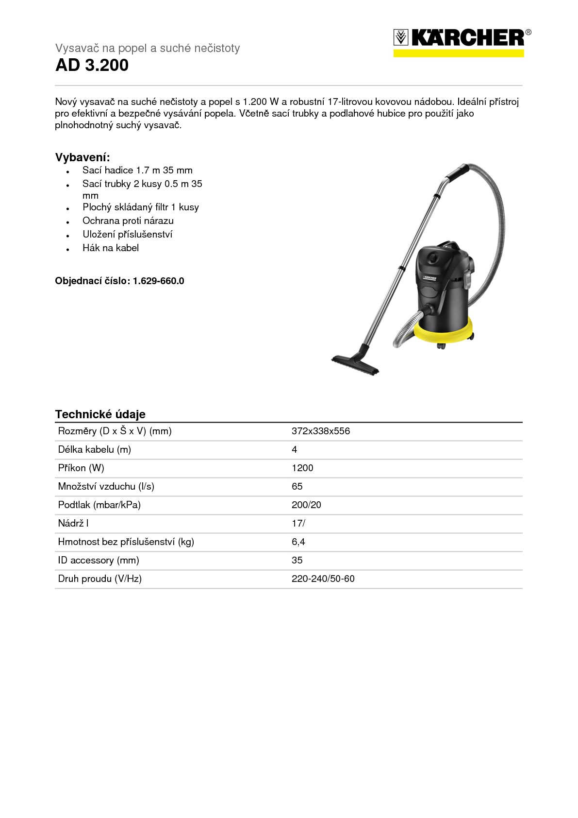 Kompaktní, praktický, všestranný: nový vysavač AD 3 Premium Fireplace na suché nečistoty a popel s 1.200 W turbínou se vyznačuje vysokou a dlouhotrvající sací silou. Díky jedinečnému filtračnímu systému, který se skládá z plochého skládacího filtru a filtru na hrubé nečistoty, mohou být vysáta velká množství popele. Kovová nádoba a sací hadice z kovu nabízí maximální bezpečnost při příjmu popele. V jednom zkušebním testování vyvinutém firmou Kärcher speciálně pro vysavač na suché nečistoty a popel byl přístroj přezkoušen TÜV Süd a certifikován. Zkosená ruční trubka nabízí optimální pracovní komfort a přesvědčí zvláště v rozích a na těžko dostupných místech v krbu. Zůstatky popela se tak dají beze zbytku vysát. V prostoru na příslušenství se dají rychle a úsporně uložit jak kabel, tak všechna dodávaná příslušenství. V dodávce je dodatečně obsažena jedna podlahová hubice, která je vhodná jak pro čištění tvrdých ploch, tak i kobercových podlahových krytin. Spolu s vysoce kvalitní pochromovanou sací trubkou je AD 3 Premium Fireplace použitelný jako plnohotný suchý vysavač všude.