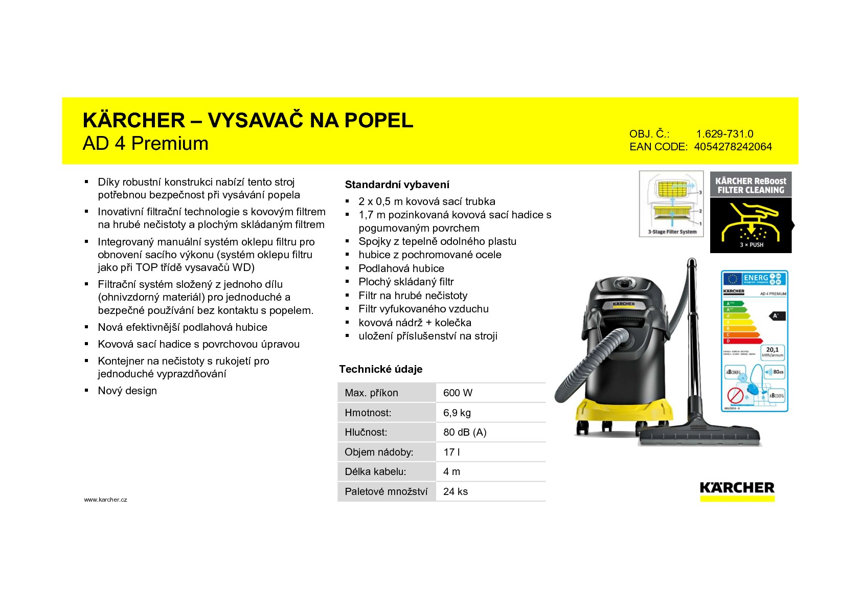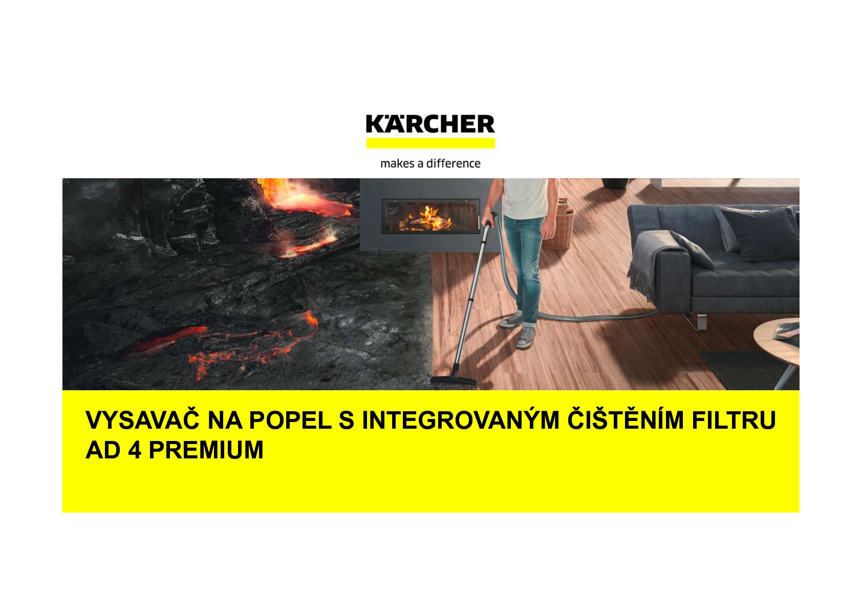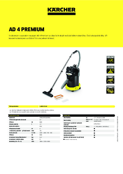 Kovová nádoba a sací hadice z kovu nabízí maximální bezpečnost při příjmu popele. V jednom zkušebním testování vyvinutém firmou Kärcher speciálně pro vysavač na suché nečistoty a popel byl přístroj přezkoušen TÜV Süd a certifikován. Zkosená ruční trubka nabízí optimální pracovní komfort a přesvědčí zvláště v rozích a na těžko dostupných místech v krbu. Zůstatky popela se tak dají beze zbytku vysát. V prostoru na příslušenství se dají rychle a úsporně uložit jak kabel, tak všechna dodávaná příslušenství. V dodávce je dodatečně obsažena jedna podlahová hubice, která je vhodná jak pro čištění tvrdých ploch, tak i kobercových podlahových krytin. Spolu s vysoce kvalitní pochromovanou sací trubkou je AD 4 Premium použitelný jako plnohotný suchý vysavač všude.