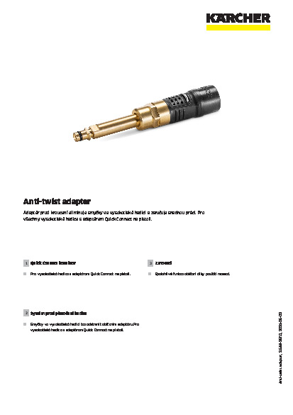 S adaptérem proti kroucení od společnosti Kärcher si při práci s tlakovým čističem užijete větší svobodu pohybu a pohodlí. Odstraňte rušivé smyčky ve vysokotlaké hadici, o které byste mohli během používání zakopnout. Jednoduše ručně otočte adaptér, abyste snadno odstranili smyčky. Adaptér lze následně jednoduše a rychle integrovat a vylepšit tak vysokotlakou hadici. Je kompatibilní se všemi vysokotlakými hadicemi s adaptérem Quick Connect na pistoli. Zaručená funkce otáčení pomocí mosazi. Vhodné pro všechna zařízení tříd K 4 až K 7.