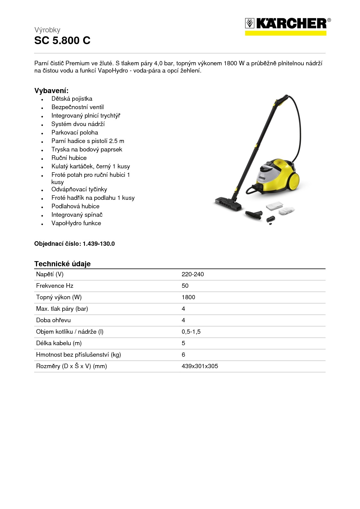 Parní čistič Kärcher SC 5.800 C komfortní třídy s maximálním tlakem 4 bar disponuje vysokou produkcí páry a zaručuje vynikající čisticí efekt i bez použití chemie. Účinně a přesto ekologicky odstraní vápenaté usazeniny, usazené mastnoty a jiné silné znečištění. Funkce VapoHydro umožňuje praktické doplnění proudu horké vody, kterým se nečistoty uvolněné párou jednoduše a pohodlně odplaví. Díky regulaci množství páry přímo na stroji lze množství páry vždy optimálně přizpůsobit příslušnému povrchu a intenzitě znečištění.