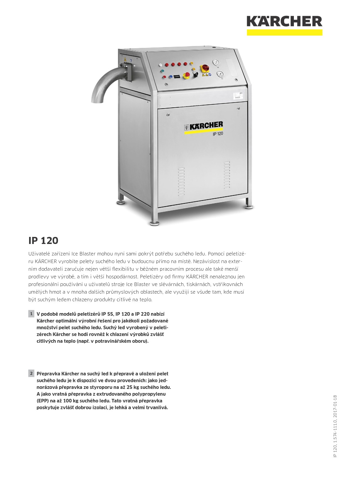 - V podobě modelů peletizérů IP 55, IP 120 a IP 220 nabízí Kärcher optimální výrobní řešení pro jakékoli požadované množství pelet suchého ledu. Suchý led vyrobený v peletizérech Kärcher se hodí rovněž k chlazení výrobků zvlášť citlivých na teplo (např. v potravinářském oboru).