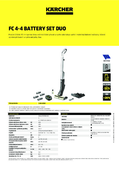 DomůDomácí technikaPodlahový mycí stroj Kärcher FC 4-4 BATTERY SET 4B Duo