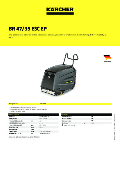 BR 47/35 ESC čistí eskalátory resp. pojízdné chodníky zcela za provozu. Stroj se umístí v dolní části eskalátoru a trysky stříkají roztok čisticích prostředků na mycí kartáče, které čistí profil pojízdného chodníku resp. eskalátoru. V témže pracovním kroku je špinavá voda odsávána. Speciální jímací kartáče absorbují vodu a transportují ji k sacím otvorům. Tvar kartáčové hlavy a motor kartáče umístěný ve středu umožňují práci se dvěma kartáčovými válci do krajů. Tak je eskalátor vyčištěn až do nejkrajnější drážky. Středicí kluzák ve střední části kartáčové hlavy zajišťuje bezpečné vedení stroje. BR 47/ 35 ESC je vhodný pro eskalátory a pojízdné chodníky různých výrobců. Nastavení na různé eskalátory je zajištěno výměnou čtyř různých sad vodicích hřebenů, které obepínají drážky ve stupních eskalátorů a těsní při odsávání.