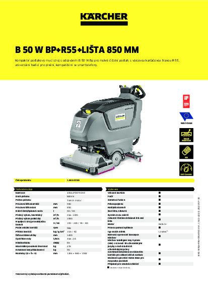 Kompaktní podlahový mycí stroj s odsáváním B 50 W Bp je ideálním zařízením pro efektivní čištění podlah a přesvědčí svou mimořádně robustní konstrukcí. Kartáčová hlava a sací lišta jsou vyrobeny z hliníkové tlakové slitiny s dlouhou životností – pro vynikající odsávání i na strukturovaných plochách a v úzkých zatáčkách. Kartáčová hlava R 55 s integrovanou funkcí zametání se spolehlivě postará o ty nejlepší výsledky čištění a čisté podlahy. Kompaktní design stroje Walk behind umožňuje ještě lepší přehled a obratnost především v těžko přístupných prostorech. Pohon kol přitom usnadňuje obsluhu a snižuje fyzickou námahu uživatelů. Čistou vodu doplníte bez problémů připojením univerzální hadice na jakýkoli vodovodní kohoutek. Pomocí aplikace „Machine connect“ lze navíc upravovat rozšířená nastavení a získávat informace zcela jednoduše přes smartphone.