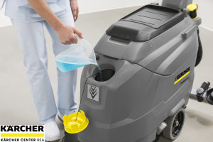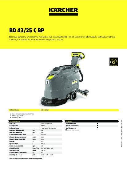 Kompaktní, obratný, tichý a lehce ovladatelný: To jsou podstatné vlastnosti ručně vedeného, bateriově poháněného podlahového mycího stroje Kärcher BD 43/25 C s odsáváním a kotoučovou technikou, pracovní šířkou 43 cm a objemem nádrže 25 litrů. Je vhodný pro menší a silně zastavěné plochy, přesvědčí Vás svou obratností a umožní Vám velmi dobrý výhled na čištěnou plochu. Systém Easy-Operation se žlutými obslužnými prvky umožní i nezaškoleným osobám bezproblémovou obsluhu stroje BD 43/25 C. Stejně tak jednoduché je i samotné čištění stroje. Doporučujeme přístroj používat pro základní a údržbové čištění ploch o velikosti až 900 m².