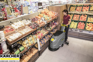 Bateriově poháněný a hospodárný: Podlahový mycí stroj Kärcher BD 43/25 C s odsáváním a kotoučovou technikou zvládne až 1700 m²/h. K základnímu a údržbovému čištění ploch až 900 m².