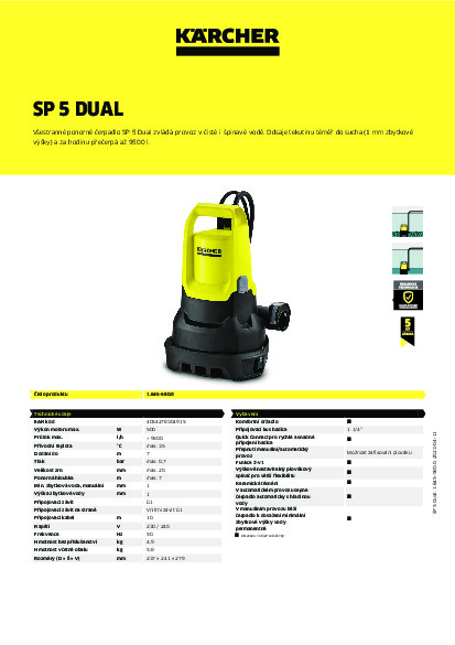 Praktické čerpadlo SP 5 Dual si poradí i se znečištěnou vodou s částicemi do velikosti 20 mm, proto se hodí k odsávání vody ze sudů či okrasných jezírek. Mistrně zvládne také odčerpání bazénů a vodních rezervoárů – díky funkci plošného sání zanechá v nádrži maximálně 1 mm zbytkové hladiny vody. Mód sání jednoduše změníte přestavěním filtračního koše. Přístroj za hodinu přečerpá až 9500 l vody, takže se nezalekne ani náročnějších úkolů. K zařízení také snadno připojíte hadici o průměru 1 1/4" pro rychlé odvedení tekutiny pouhým nacvaknutím. Čerpadlo nabízí manuální a automatický režim provozu. V automatickém režimu řídí chod přístroje výškově nastavitelný plovákový spínač, který reguluje provoz přístroje v závislosti na výšce hladiny vody. Součástí čerpadla je kvalitní keramické těsnění, které zajišťuje dlouhou životnost přístroje. Zákazníkům navíc zdarma garantujeme prodlouženou záruku 5 let – stačí si zařízení zaregistrovat na našem webu.