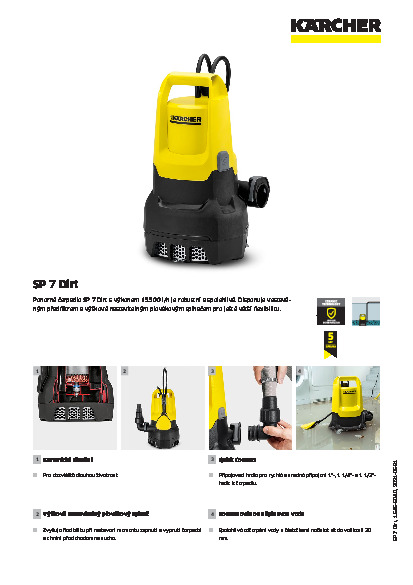 SP 7 Dirt je nejvýkonnější ponorné čerpadlo na špinavou vodu od společnosti Kärcher. S čerpacím výkonem až 15.500 l/h se perfektně hodí pro obzvláště náročné úkoly odčerpávání jako např. ve velkých zahradních jezerech, zatopených sklepech nebo zaplavených stavebních jámách (objem max. 100 m³). Přitom mohou být ve vodě obsažené částečky nečistot až o velikosti 30 mm. Hrozí-li ucpání velkými nečistotami, může být pro ochranu oběhového kola čerpadla stažen dolů vestavěný předfiltr z ušlechtilé oceli. Kvalitní těsnění, které je známo i v oblasti Profi, zaručuje čerpadlu velmi dlouhou životnost. Záruční lhůta může být volitelně prodoužena na 5 let. Plovákový spínač umožňuje další praktické funkce: Automaticky zapíná a vypíná v závislosti na stavu vody čerpadlo, zabraňuje chodu čerpadla na sucho a lze jej výškově nastavit. Navíc může být připevněn k čerpadlu, takže ponorné čerpadlo v trvalém provozu může odčerpávat až do 35 mm výšky zbytkové vody. Připojovací hrdlo Quick-Connect umožňuje velmi rychlé připojení 1"-, 1 1/4"- a 1 1/2"-hadic.