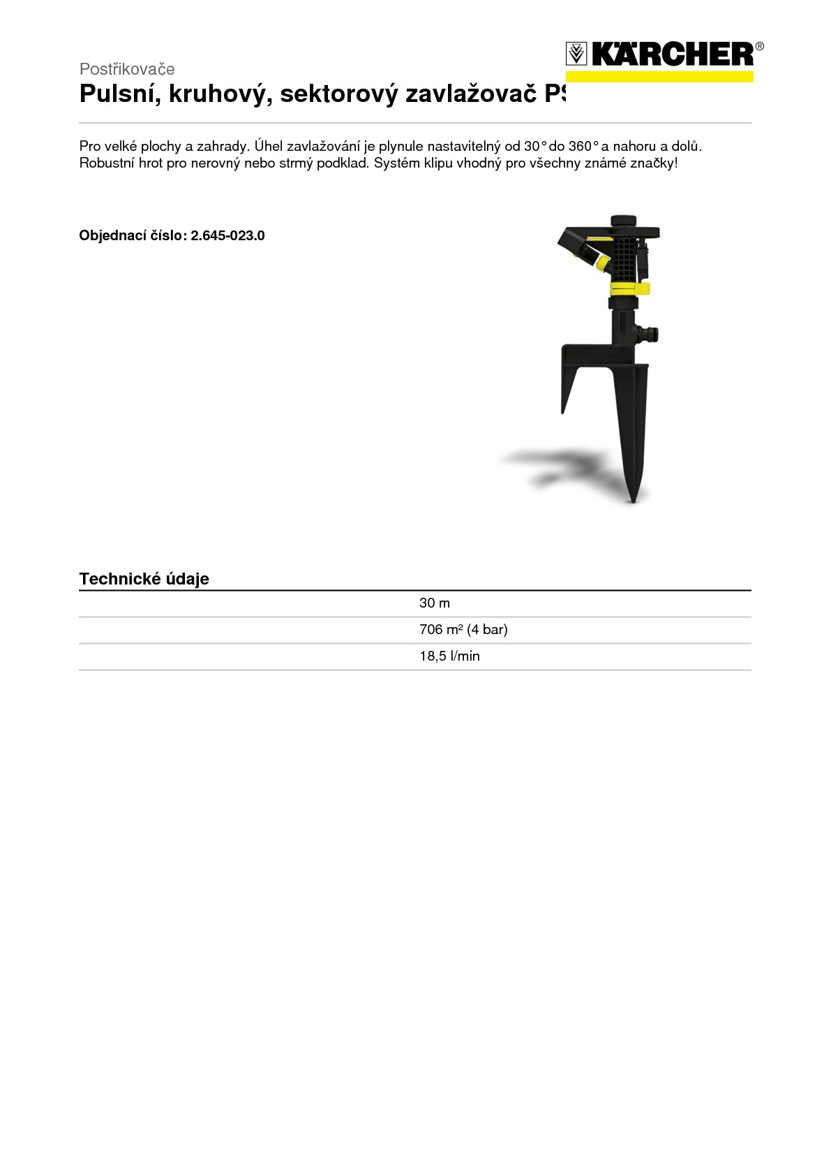Kärcher Impulzní, kruhový a sektorový Zavlažovač PS 300 je vhodný pro velké plochy a zahrady. Úhel zavlažování je plynule nastavitelný od 30° do 360° a nahoru a dolů. Robustní hrot pro nerovný nebo strmý podklad. Systém klipu vhodný pro všechny zn