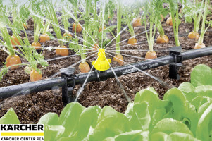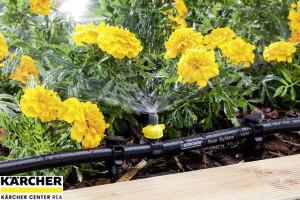 Postřikovací manžetu s vestavěnou jehlou lze k hadici systému Kärcher Rain System™ připojit na jakémkoliv místě. Nastavitelné postřikovače (mikropostřikovače) lze nastavit podle potřeby.