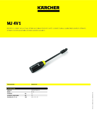 MJ 160 4-in-1 Multi Jet nabízí 4 různé typy proudu v jedné stříkací tyči: proud s čisticím prostředkem, vysokotlaký plochý proud, rotační trysku a široký plochý proud. Stačí otočit stříkací trysku a vybrat správný proud. Časově náročná výměna stříkací trysky již není nutná. Zároveň Multi Jet zaujme snadnou manipulací a větším komfortem při použití díky 25% snížení hmotnosti oproti svému předchůdci, Kärcher MJ 3 v 1. Vhodný pro tlakové čističe Kärcher K 4 a K 5. Univerzální pomocník pro dům, zahradu a auto.