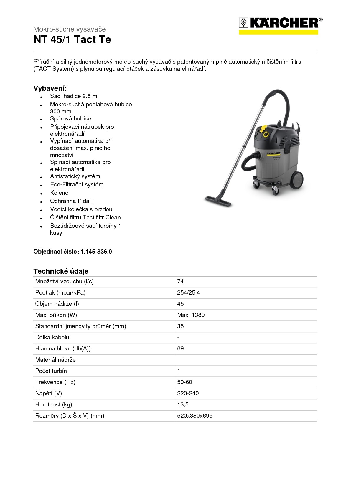Průmyslový vysavač Kärcher NT 45/1 Tact TE je určený na vysávání suchých i mokrých nečistot a je snadno obsluhovatelný a vhodný pro univerzální použití. Je schopen vysát prach, suché nečistoty a kapaliny. Disponuje robustní nárazu vzdornou plastovou nádobou o velikosti 45 l s dlouhou životností a o nízké hmotnosti pro bezproblémové přenášení. Je vybaven velmi praktickým plochým skládaný filtrem, který zvyšuje užitný objem nádoby na nečistotu, protože do ní nezasahuje a plně automatickým čištěním filtru, které umožňuje vysávání velkého množství prachu bez přerušení práce s konstantě vysokým sacím výkonem.