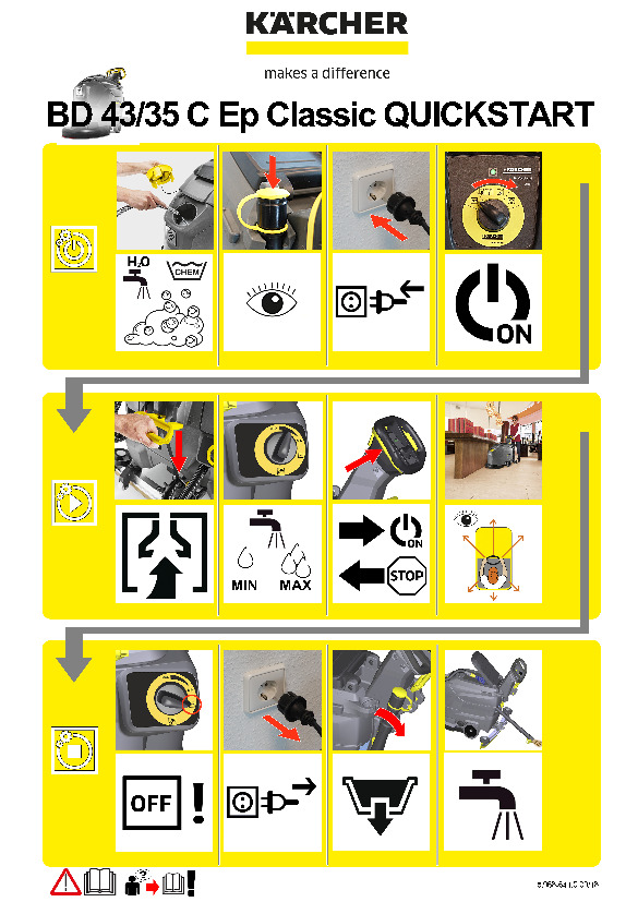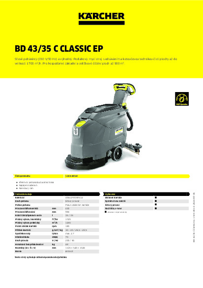 U síťově poháněného (230 V/50 Hz) podlahového mycího stroje Kärcher BD 43/35 C Classic Ep s odsáváním a kotoučovou technikou odpadá možnost bateriového pohonu, čímž se provoz stroje stává výhodným. Technické vybavení stroje je na obvyklé vysoké úrovni: Zaujme pracovní šířkou 43 centimetrů, objemem nádrže 35 litrů, 750 milimetrovou sací lištou ve tvaru V a velmi snadno se ovládá díky systému EASY Operation se žlutými ovládacími prvky. Navíc je velmi tichý a čištění je dětskou hrou. Obratný BD 43/35 C Ep je ideální pro menší a silně zařízené plochy do 900 m². Jeho kompaktní rozměry navíc umožňují optimální přehled o čištěné oblasti.