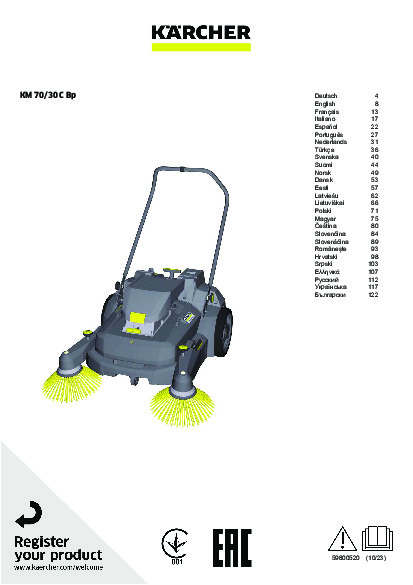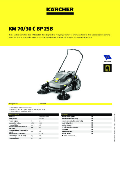Ručně vedený zametací stroj KM 70/30 C Bp 2SB je efektivní a účinné řešení pro čištění tvrdých povrchů v interiéru i exteriéru. Zametací válec a boční kartáče jsou poháněny baterií a výrazně zvyšují komfort práce: uživatelé mohou bez námahy zametat rohy a těžko přístupná místa s výrazně menší potřebou síly. Plochý skládaný filtr s aktivním odsáváním snižuje tvorbu prachu i při odstraňování velkého množství jemného prachu a udržuje pracovní prostředí čisté. Zametací válec lze nastavit v šesti stupních a přizpůsobit tak jeho čisticí výkon různým povrchům. Práci usnadňuje praktická odkládací plocha pro další vybavení, jako jsou kbelíky a sběrače odpadků. Jednoduchá je také údržba, k výměně bočního kartáče a filtru není třeba žádné nářadí. Bateriová platforma Kärcher Battery Power+ s napětím 36 V poskytuje dostatečný výkon v každé situaci. Vyměnitelnou baterie lze vyjmout pro snadnou přepravu. Baterie a nabíječka nejsou součástí dodávky.