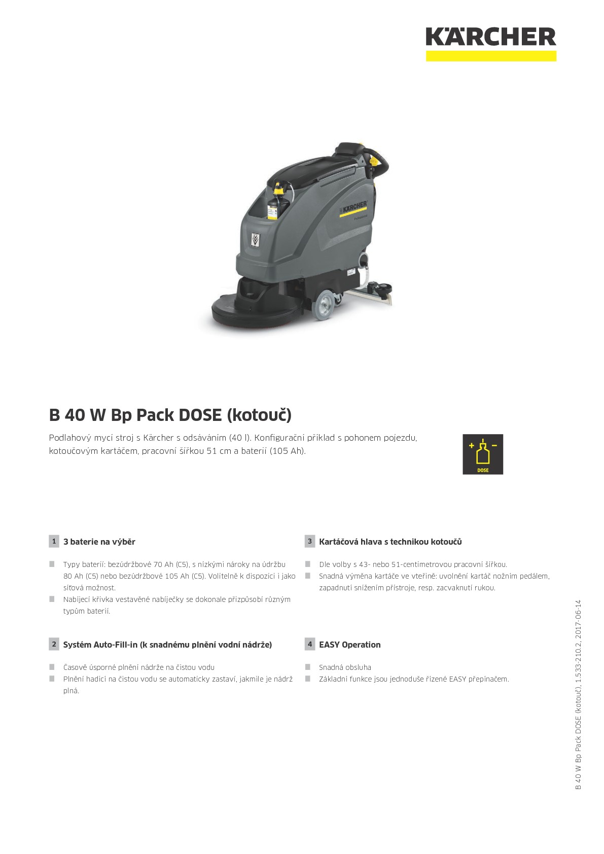Podlahový mycí stroj Kärcher s odsáváním a plynulým pohonem pojezdu (dopředu a dozadu). S kartáčovou hlavou a diskovým kartáčem, pracovní šířkou 51 cm, bezúdržbovou baterií (24 V, 105 Ah) a systémem klíčů KIK pro ochranu před chybnou obsluhou. Kromě toho: stupeň eco!efficiency pro delší dobu běhu baterií, funkcí Auto-Fill pro pohodlné naplnění nádrže na vodu