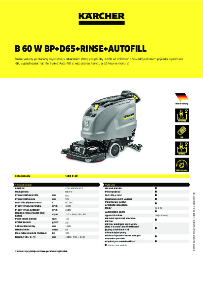 Ručně vedený podlahový mycí stroj s odsáváním B 60 W Bp s pohonem, systémem klíčů KIK a vyplachováním nádrže nabízí komfort i snadnou a bezpečnou manipulaci. Systémem klíčů KIK jsou udělována přístupová práva k zamezení chybných kroků obsluhy. Kartáčová hlava s kotoučovou technikou D 65 (pracovní šířka 65 cm) a počet otáček až 180 ot./min předurčuje stroj pro čištění nestrukturovaných podlah s plošným výkonem až 2.500 m². Přítlak kotouče je nastavitelný, přičemž hlavu i kotouč rychle namontujete i vyměníte. Stupeň eco!efficiency zásadně prodlouží dobu chodu baterie a systém vyplachování nádrže zjednoduší čištění nádrže na špinavou vodu po vyčištění podlahy. To vše završuje funkce Auto Fill pro jednoduché a časově nenáročné plnění nádrže na čistou vodu. Navíc se sací lišta tvaru V o pracovní šířce 900 milimetrů postará o odsávání nečistot beze zbytků i při jízdách v zatáčkách.