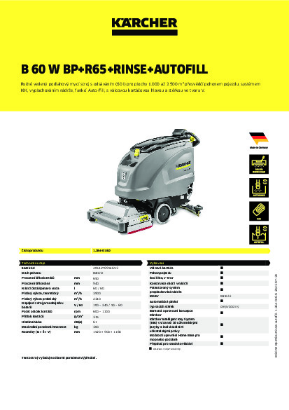 DomůPodlahové mycí strojePro chodící obsluhu - bateriovéPodlahový mycí stroj s odsáváním Kärcher B 60 W Bp+R65+Auto-fill+Rins+V900