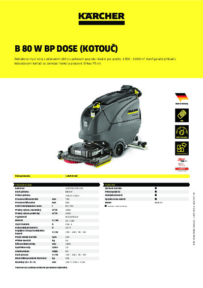 Ruční mycí stroj B 80 W Bp pro různé typy baterií (24 V, 170–240 Ah). S kartáčovou hlavou a kotoučovými kartáči, plně automatickým zvedáním a spouštěním stěrky, pracovní šířkou 75 cm, velkým barevným LCD displejem, trakčním pohonem a systémem klíčů KIK, který zabraňuje chybám při obsluze. Plus režim eco!efficiency pro delší výdrž baterie, systém proplachování nádrže pro automatické čištění nádrže na špinavou vodu bez stříkání a také funkce Auto-Fill pro snadné plnění nádrže na vodu. Poznámka: Toto je ukázková konfigurace. Stroj je k dispozici v různých možnostech konfigurace, např. s různými bateriemi, s dávkovačem mycího prostředku DOSE nebo s pracovní šířkou 65 cm.